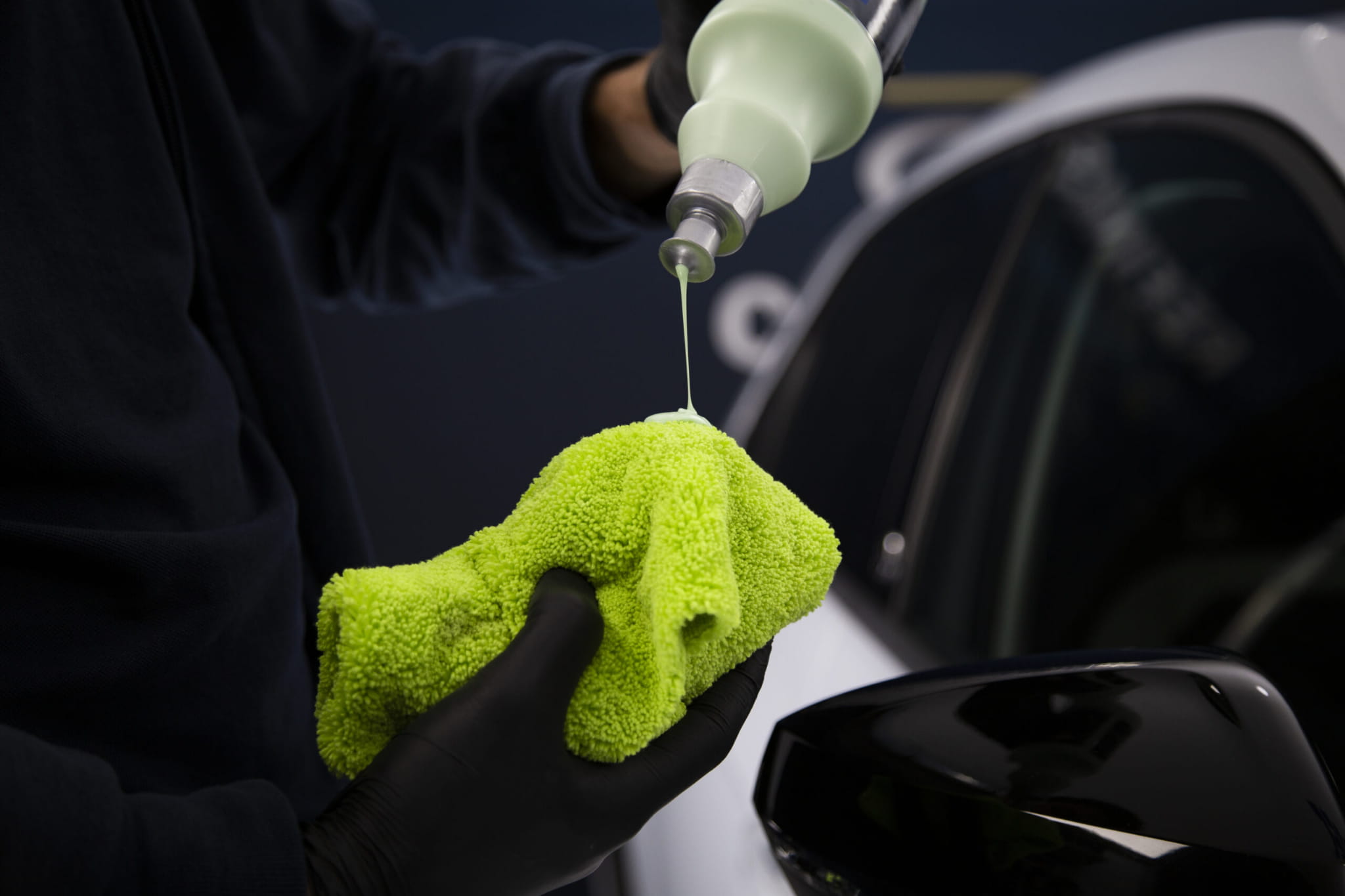 - Nałóż Cartec Perfect Polish na powierzchnię lakieru czystą, miękką ściereczką (np. 3317/51) lub gąbką aplikacyjną (3211/4), wykonując okrężne ruchy. W przypadku rys i zabrudzeń zwiększ nacisk i poleruj do momentu ich usunięcia.